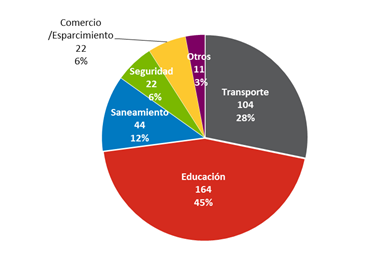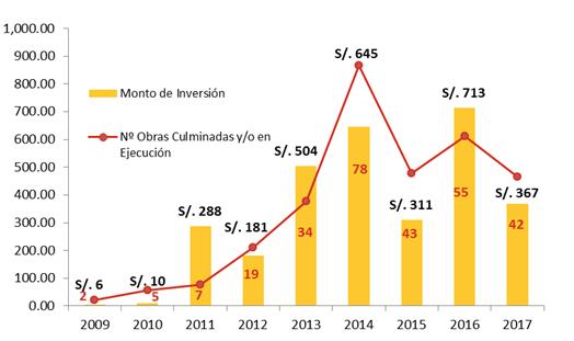 En 2017, se vienen adjudicando 42 proyectos por S/ 367 millones, monto 71% superior que el alcanzado a la misma fecha el año anterior. Los sectores en los que predomina la ejecución de Obras por Impuestos en el 2017, considerando el monto invertido son: Educación (45%), Transporte (28%), Saneamiento (12%), Seguridad (6%), Comercio/Esparcimiento (6%) y otros (3%).