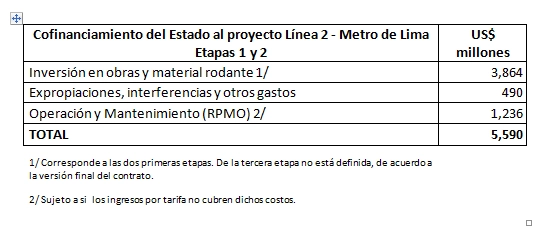 El Estado contribuye financieramente al proyecto Línea 2 cofinanciando 3 ítems: US$ 3,864 millones para la inversión obligatoria en obras y material rodante de las dos primeras etapas; US$ 490 millones por pago de expropiaciones, interferencias y otros gastos, y US$ 1,236 millones para la operación y mantenimiento (Retribución por Mantenimiento y Operación o RPMO) por los primeros 18 años de operación, si los ingresos por tarifa no cubren dichos costos, lo cual es muy probable. En total, la suma máxima posible del cofinanciamiento en las etapas 1 y 2 sería US$ 5,590 millones, (ver tabla), no siendo cierto entonces que el aporte total del Estado al proyecto Línea 2 del Metro superará los US$ 10,000 millones. Se prevé que a partir del año 23 de concesión hasta el año 35 el monto de RPMO será cubierto por los ingresos del concesionario como resultado del cobro por tarifas a los usuarios.