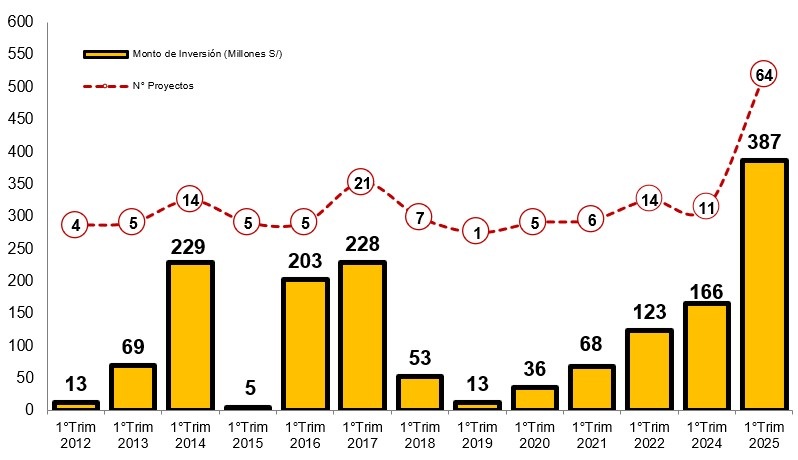 In the first quarter of 2025, public entities (ministries, regional governments, local governments, and public universities) awarded 64 investments worth S/ 387 million. The amount awarded is 133% more than in the first quarter of 2024 (S/ 166 million).