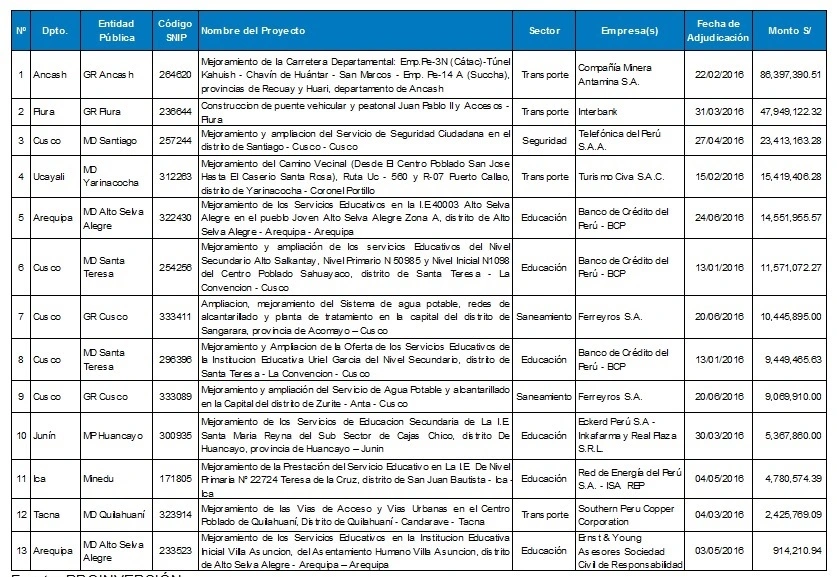 Among the projects awarded in the first half year we can name the following: Upgrade of the Departmental Highway – Kahuish Tunnel, for S/ 86.3 million, puto ut to tender by Regional Government of Ancash and awarded to Compañía Minera Antamina S.A.; Construction of the Juan Pablo II vehicular bridge and footbridge plus accesses in Piura, for S/ 47.9 million, put out to tender by the Regional Government of Piura and awarded to Banco Internacional del Perú S.A.A. (Interbank); Upgrading and expansion of public safety service in Santiago de Cusco district (Cusco), for S/ 23 million, put out to tender by the District City Council of Santiago and awarded to Telefónica del Perú S.A.A.; and Upgrading of the Camino Vecinal for S/ 15.4 million put out to tender by by the District City Council of Yarinacocha, Coronel Portillo province, departmento of Ucayali, awarded to Turismo Civa S.A.C. The complete list of projects is as follows: