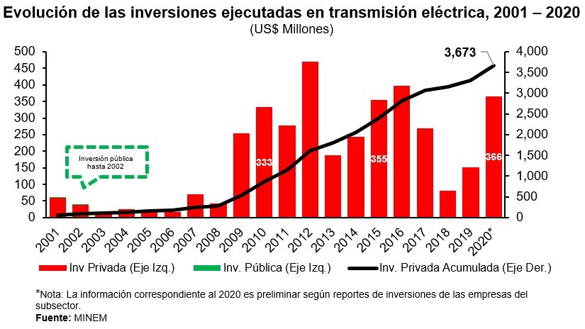 Las inversiones en APP, realizadas por los concesionarios en líneas de transmisión eléctrica, han superado los $3,600 millones entre el 2001 y el 2020. En particular, se destaca el incremento constante de las inversiones asociadas a la adjudicación de proyectos realizados desde el 2008. De hecho, se han adjudicado 27 proyectos de trasmisión de electricidad desde el 2008 que han permitido interconectar la red eléctrica de todo el país y 16 de estos proyectos están en la etapa de operación.