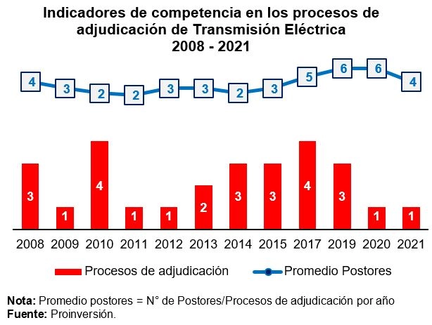 Desde la creación del sistema de planificación de transmisión eléctrica en el año 2006, se le han venido encargando la adjudicación de proyectos a PROINVERSIÓN. Estás adjudicaciones han sido realizadas de forma exitosa ya que generaron cada vez más competencia y atrajeron a nuevos inversionistas internacionales. Por ejemplo, desde el 2015 hasta la fecha, hemos tenido 5 postores en promedio por proyecto en las licitaciones de las líneas de transmisión. Además, los valores ofertados por los postores ganadores fueron muy competitivos y generaron ahorros importantes para el país. Así, en promedio, en las 10 últimas licitaciones, la oferta ganadora estuvo por debajo del valor máximo establecido por el gobierno en más de un 40%.