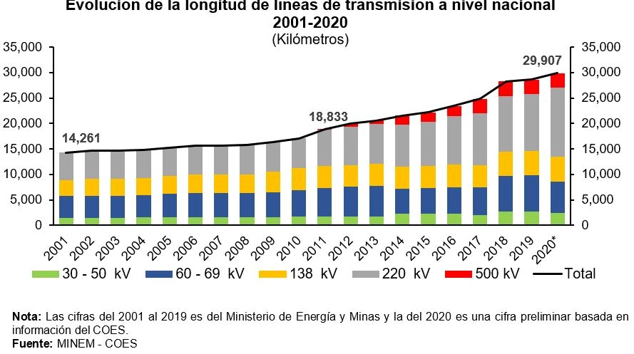 Primero, gracias a estas inversiones, se ha registrado un crecimiento sostenido de la longitud de las líneas de transmisión de alta y muy alta tensión. En particular, se ha tendido líneas de transmisión por cerca de 30 mil kilómetros al cierre de 2020, equivalentes a más de 9 veces la longitud del litoral peruano. Más recientemente, se ha incorporado líneas de transmisión de 500 Kv que se caracterizan por ser más eficientes y tener menores pérdidas cuando transportan electricidad en largas distancias.