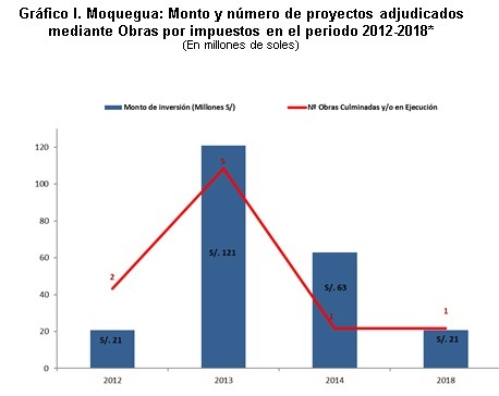 Desde la creación de este mecanismo (2009) hasta agosto de 2018, Moquegua ha comprometido S/ 228 millones en nueve (9) proyectos de inversión pública. Esto ha sido posible por el compromiso y trabajo conjunto de ProInversión con el Gobierno Regional, tres (8) municipalidades provinciales, tres (3) municipalidades distritales y seis (6) empresas que vienen participando en el financiamiento de proyectos de inversión pública a través de Obras por Impuestos, beneficiando a más 346 mil moqueguanos.