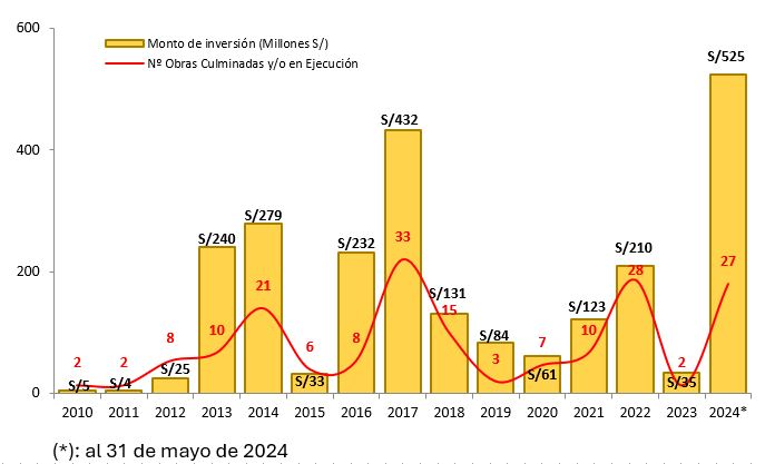 Considerando el avance registrado entre enero y mayo, se ha acumulado 545 proyectos adjudicados en los 16 años de implementación del mecanismo OxI, con un monto de inversión en S/ 8 126 millones, beneficiando a 22 millones de peruanos.