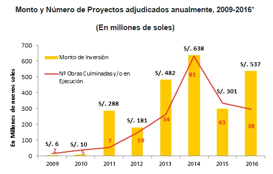 Desde la creación del mecanismo (2008) a la fecha, se han comprometido S/ 2,443 millones en 229 proyectos de inversión pública. Esto ha sido posible por el compromiso y trabajo conjunto de 14 Gobiernos Regionales, 29 Municipalidades Provinciales, 75 Municipalidades Distritales, tres (3) entidades del Gobierno Nacional y 77 empresas que vienen participando en el financiamiento de proyectos de inversión pública a través de esta modalidad.