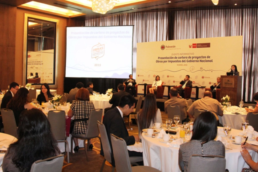 Lima, 31 de marzo de 2015.- ProInversión reunió a más de 100 ejecutivos del sector privado para presentar la cartera de proyectos de Obras por Impuestos de entidades del Gobierno Nacional. Durante el evento se dio a conocer los proyectos priorizados en materia de Salud, Educación, Agricultura y Riego, y Orden Público y Seguridad para ser ejecutados a través del mecanismo de Obras por Impuestos.
