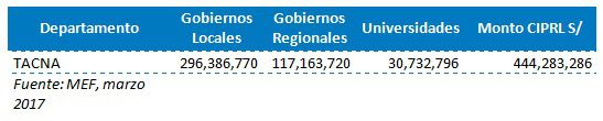 De otro lado, la región Tacna cuenta con aproximadamente S/ 444 millones (como límite para emitir los Certificados de Inversión Pública Regional y Local – CIPRL) para ejecutar proyectos a través del mecanismo Obras por Impuestos. De los S/ 444 millones, las municipalidades de Tacna cuentan con S/ 296 millones, el Gobierno Regional de Tacna con S/ 117 millones y la universidad pública con S/. 31 millones.