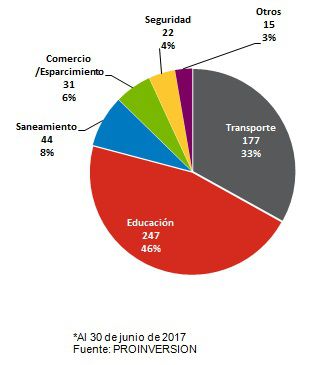 Los sectores en los que predomina la ejecución de Obras por Impuestos en 2017, considerando el monto invertido, son: Educación (46%), transporte (33%), saneamiento (8%), comercio y esparcimiento (6%), seguridad (4%) y otros (3%).