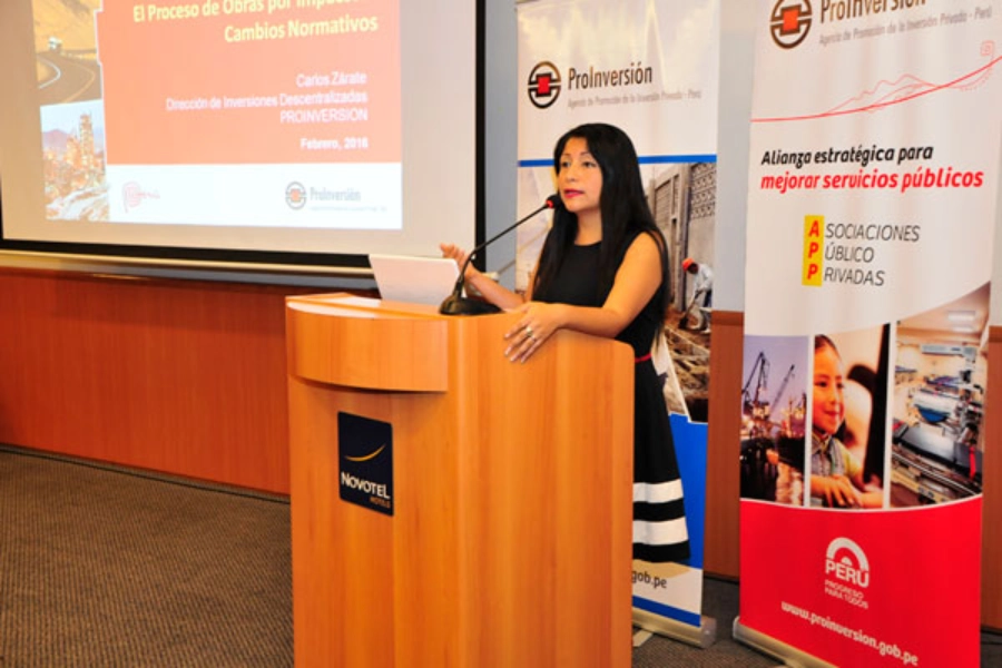 Las exposiciones sobre la “Promoción de la Inversión Privada Descentralizada: APPs y proyectos en Activos” y “Las fases del Proceso de una APP” estuvieron a cargo de Lucy Henderson Palacios, Sub directora de Conocimiento de la Dirección de Promoción de Inversiones de ProInversión. Mencionó que los cambios a la ley de APPs tienen como finalidad dinamizar la inversión en el país, porque regulan los procesos y modalidades de promoción de la inversión privada para el desarrollo de infraestructura pública, servicios públicos, servicios vinculados a estos, proyectos de investigación aplicada y/o innovación tecnológica, mediante la modalidad de APP y la ejecución de Proyectos en Activos.