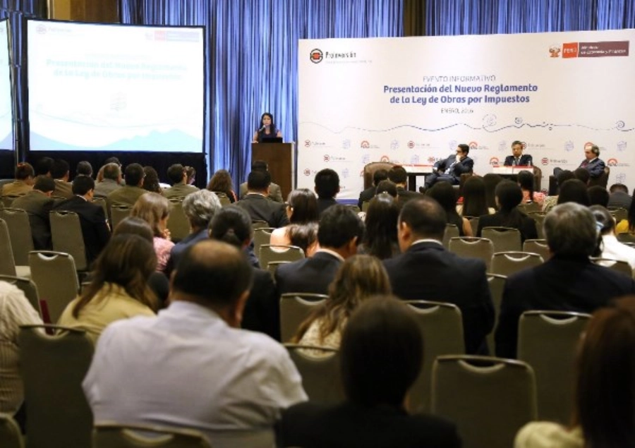 Lima, 11 de enero de 2016.- La agencia de Promoción de la Inversión Privada (ProInversión), conjuntamente con el Ministerio de Economía y Finanzas (MEF), realizó el evento informativo “Presentación del nuevo reglamento de la Ley de Obras por Impuestos”, dirigido a representantes de las empresas privadas, consultores y funcionarios de los ministerios y sectores que ejecutan proyectos de inversión pública en los sectores priorizados por la Ley de Obras por Impuestos.