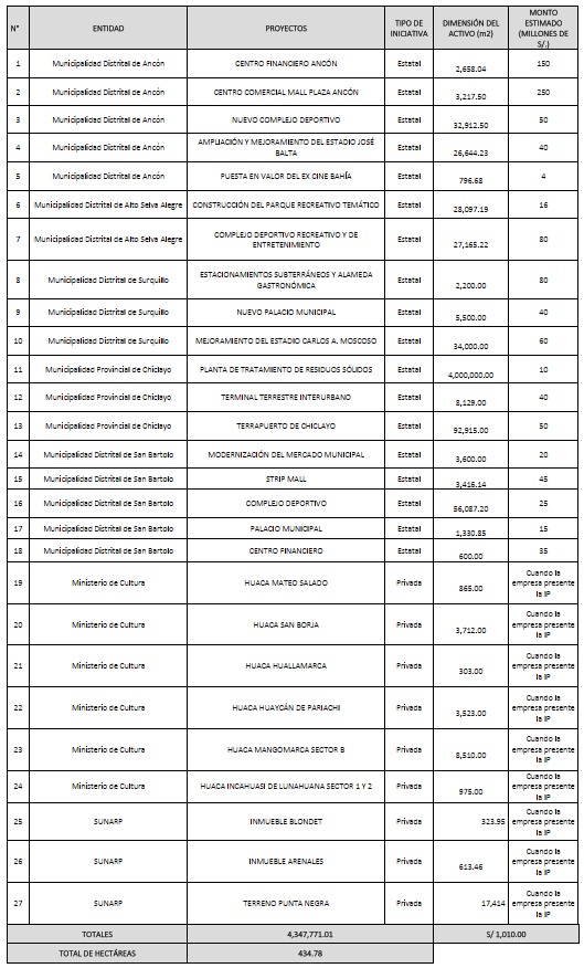 Se trata de proyectos de gran valor, con terrenos saneados o próximos a ser saneados y que podrían convertirse en centros comerciales y financieros, estacionamientos, parques recreativos temáticos, planta de tratamiento de residuos sólidos, terminal terrestre (terrapuerto) y la puesta en valor de diversas huacas, entre otros.