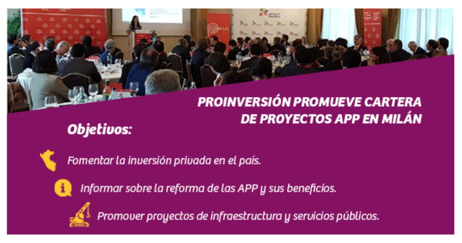 Lima, 23 de marzo de 2017.- La Agencia de Promoción de la Inversión Privada (ProInversión) promovió la cartera de proyectos de Asociaciones Público Privadas (APP) en el evento “El Perú en la economía global. Oportunidades en los sectores de energía e infraestructura de transporte”, organizado por ProInversión conjuntamente con la Embajada de Perú en Italia y la Oficina Comercial de Perú en Milán.