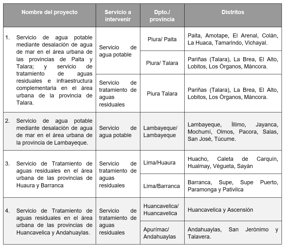 Estas cuatro IPC, que requieren una inversión total aproximada de S/ 1,141 millones, forman parte de la estrategia del Estado peruano para reducir las brechas de infraestructura y servicios de saneamiento en los cinco departamentos, creando mejores condiciones de desarrollo a más de 622 mil peruanos.