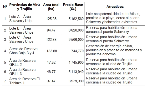 Las características, precios base y condiciones de venta de los inmuebles a subastar se detallan en las Bases y circulares, que están a disposición en las oficinas de ProInversión y en la página web de la institución: www.proinversion.gob.pe.
