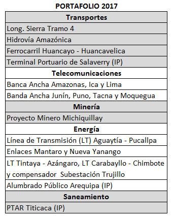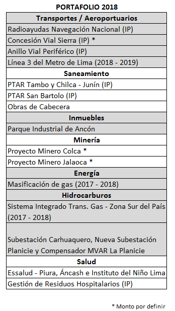 Para el 2018, la cartera es de 19 proyectos, por un monto total de US$ 10,300 millones, en donde se incluye la nueva licitación del Gasoducto Sur Peruano (GSP), pero con el nombre de Sistema Integrado Transporte Gas – Zona Sur del País que se está haciendo proyecto por proyecto y a través de la cartera completa hasta el año 2018, para que exista mayor interés de inversionistas que no quieren venir al país por un solo proyecto.