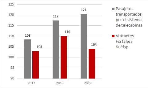 Primero, las Telecabinas Kuélap han incrementado las visitas al centro arqueológico Kuélap y generado mayor turismo en la región Amazonas. Antes de la ejecución del proyecto solo se tenía dos formas de acceder a Kuélap (vehículo o caminata), lo que era riesgoso y costoso en tiempo. Sin embargo, la ejecución del proyecto ha permitido reducir el tiempo de tránsito desde el distrito de Tingo hasta Kuélap de dos (2) horas aproximadamente a solo 20 minutos. Esta mejora en tiempo permitió que despegara el atractivo turístico de la zona. El proyecto inició su operación comercial en marzo de 2017, haciendo que el complejo arqueológico de Kuélap pase de tener 56 mil visitantes en 2016 a 103 mil en 2017, incrementándose la llegada de turistas en 84% en tan solo un año. De hecho, Lahura (2019) estima que las telecabinas permitieron aumentar las visitas a Kuélap en 100% respecto de un indicador sintético que busca capturar la situación del resto arqueológico sin las telecabinas.