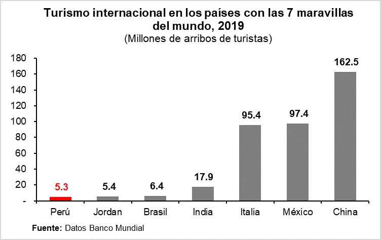 El país tiene aún mucho potencial natural y cultural que aprovechar, garantizando su sostenibilidad. De hecho, Perú tiene 1,729 sitios naturales, 2,187 manifestaciones culturales y cuenta con una de las maravillas del mundo. Sin embargo, el 92% de los recursos turísticos inventariados aún no brindan los servicios adecuados al público, lo que genera un amplio espacio por mejorar. De hecho, cuando comparamos el arribo de turistas internacionales con otros países con maravillas del mundo aún estamos por detrás de varios de ellos (Ver gráfico).