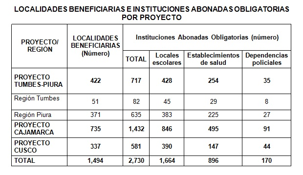 Cada uno de los cuatro proyectos tiene como propósito brindar acceso a Internet e intranet de Banda Ancha a las instituciones públicas y privadas, así como a la población de 1,494 localidades de Cajamarca, Cusco, Piura y Tumbes.