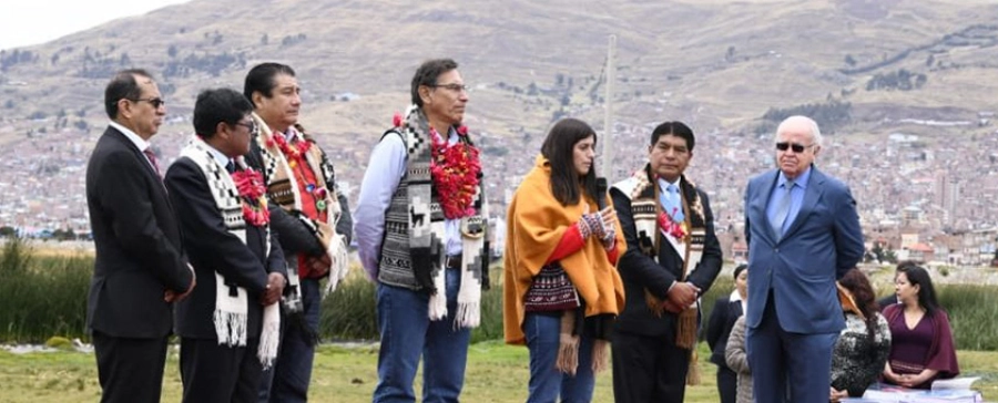 Puno, 15 de noviembre de 2019.- El Presidente de la República, Martín Vizcarra, llegó hoy a Puno, acompañado por la Ministra de Economía y Finanzas y Presidenta del Consejo Directivo de ProInversión, María Antonieta Alva, y el Ministro de Vivienda, Construcción y Saneamiento, Rodolfo Yañez, para encabezar el acto público de entrega de los contratos de concesión de PTAR Titicaca a los alcaldes de las 10 provincias vinculadas al proyecto.